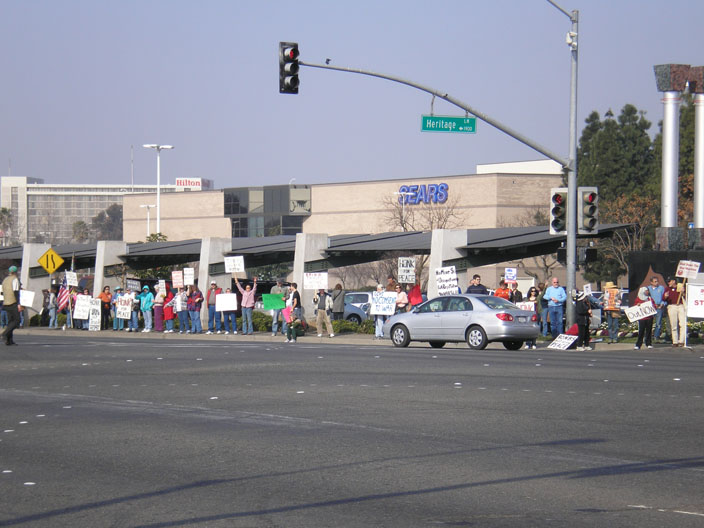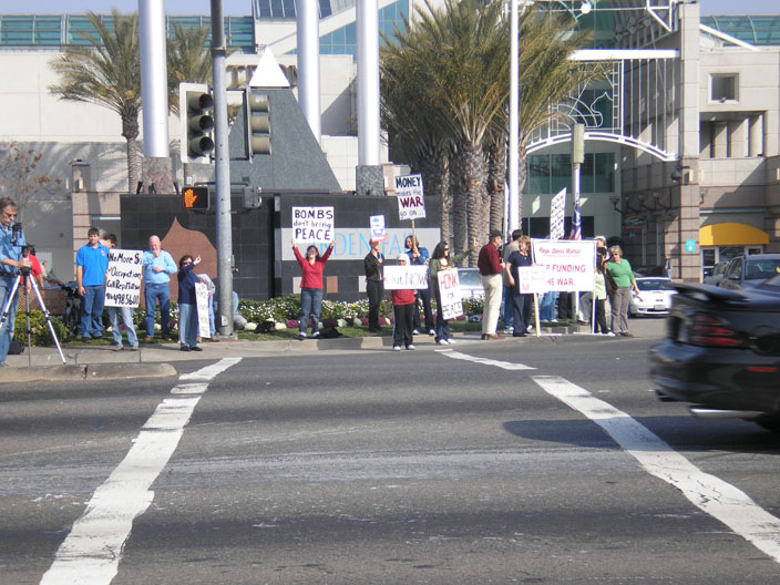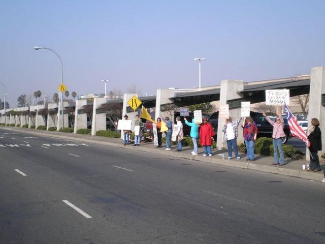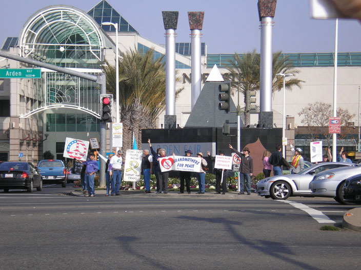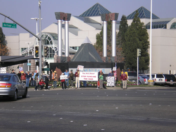On Saturday, January 27, a diverse group of citizens gathered in front of Arden Fair Mall in Sacramento to protest Bush's escalation of the war in Iraq. They held signs calling for an end of the occupation and Congressional funding for it. One of the larger signs specifically urged Rep. Doris Matsui to stop voting to fund the war. This event was held in solidarity with the National Day of Protest.