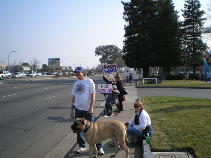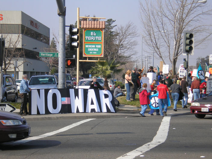 More than 100 people gathered at the intersection of Arden Way and Heritage Lane in Sacramento to protest the continued war and occupation of Iraq.