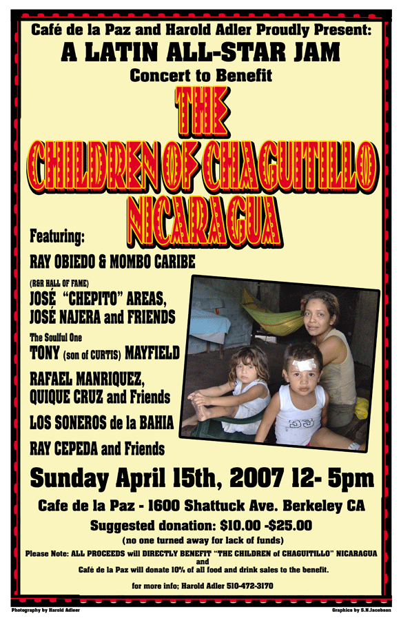 Please Note: ALL PROCEEDS with DIRECTLY BENEFIT "THE CHILDREN of CHAGUITILLO" NICARAGUA (Funds will purchase Childrens Shoes and School Books) Cafe' de la Paz will donate 10% of all food and drink sales to the benefit.