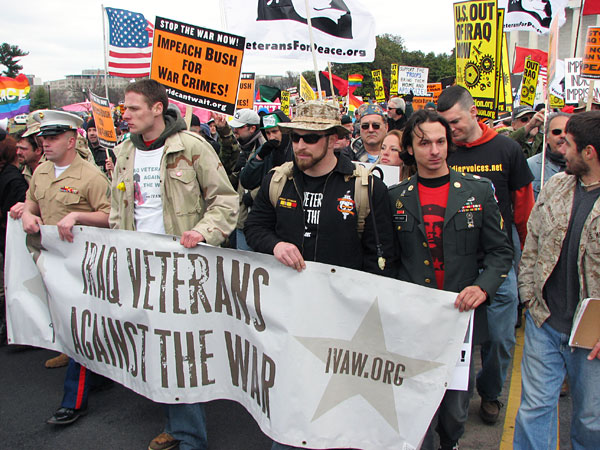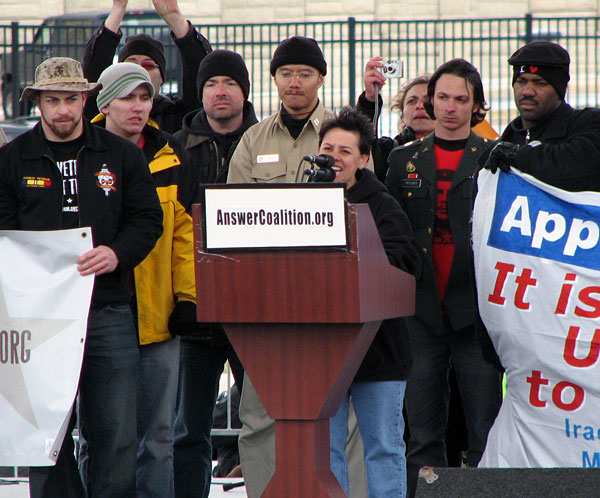 WASHINGTON DC (March 17, 2007) – On the 40th anniversary of the historic anti-Vietnam War march on the Pentagon, tens of thousands again marched on the Pentagon – this time of course to demand “U.S out of Iraq now!” Organized by the ANSWER Coalition, and leg by Iraq Veterans Against the War, military families and GI resisters, the march began at the Lincoln Memorial and crossed the Arlington Memorial Bridge before turning south towards the Pentagon. Anita Dennis, speaking in front of the Pentagon for Courage to Resist with a stage lined with Iraq veterans, called on the rally to support the troops that refuse to fight – as her son Darrel Anderson did after returning from his first tour of duty in Iraq.