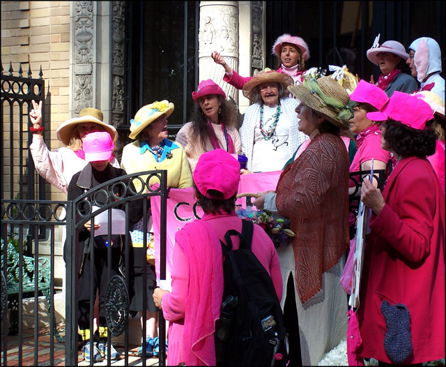 Just part of a very busy Easter Sunday that started in the morning on the Golden Gate Bridge, Bill Carpenter captured CodePink and Raging Grannies on camera as they went a'knockin' on Diane Feinstein's door. The trek from Feinstein's home to Camp Pelosi was arduous, but the Power of Peace prevailed and a gigantic Gandhi made it with a lot of help from Persons in Pink. Raging Grannies took the easy way out and travelled via hybrid Grannymobiles....