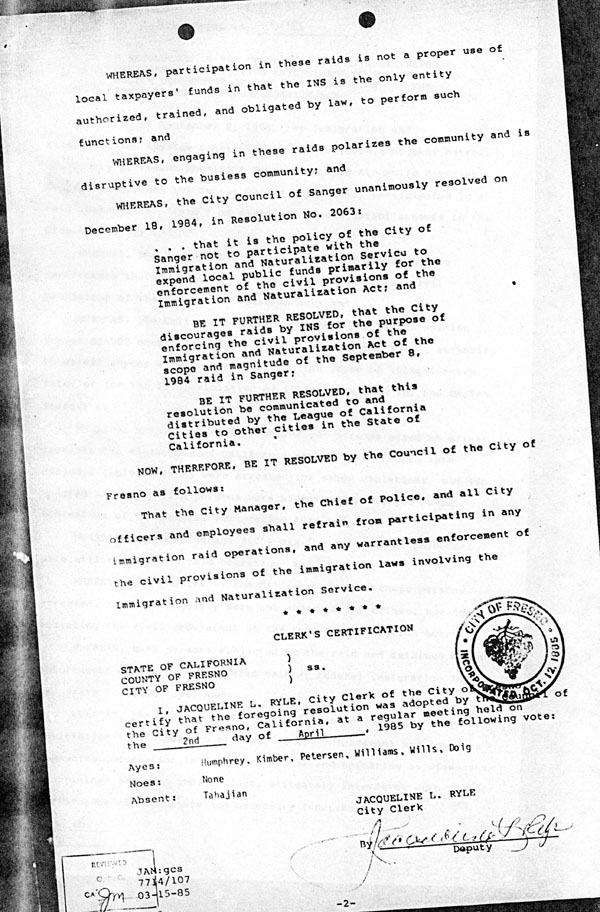 In light of the above mentioned balked vote, I decided to begin to look at stances that the Fresno City Council took in the past in relation to immigration raids, below is an example from 1985.