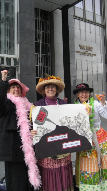 It was Plutocrats in Pink as Raging Granny Gail S joined CodePink pals in glamorous evening wear. Other members of the Raging Grannies Action League were a bit mu'u mu'u-riffic (having just returned from extended South Seas Island vacations, daaaahling). We all joined Ronald Reagan Home for the Criminally Insane, portraying Oil Execs, NeoCons, and assorted socialites celebrating yet another law that will make the filthy rich even filthier!