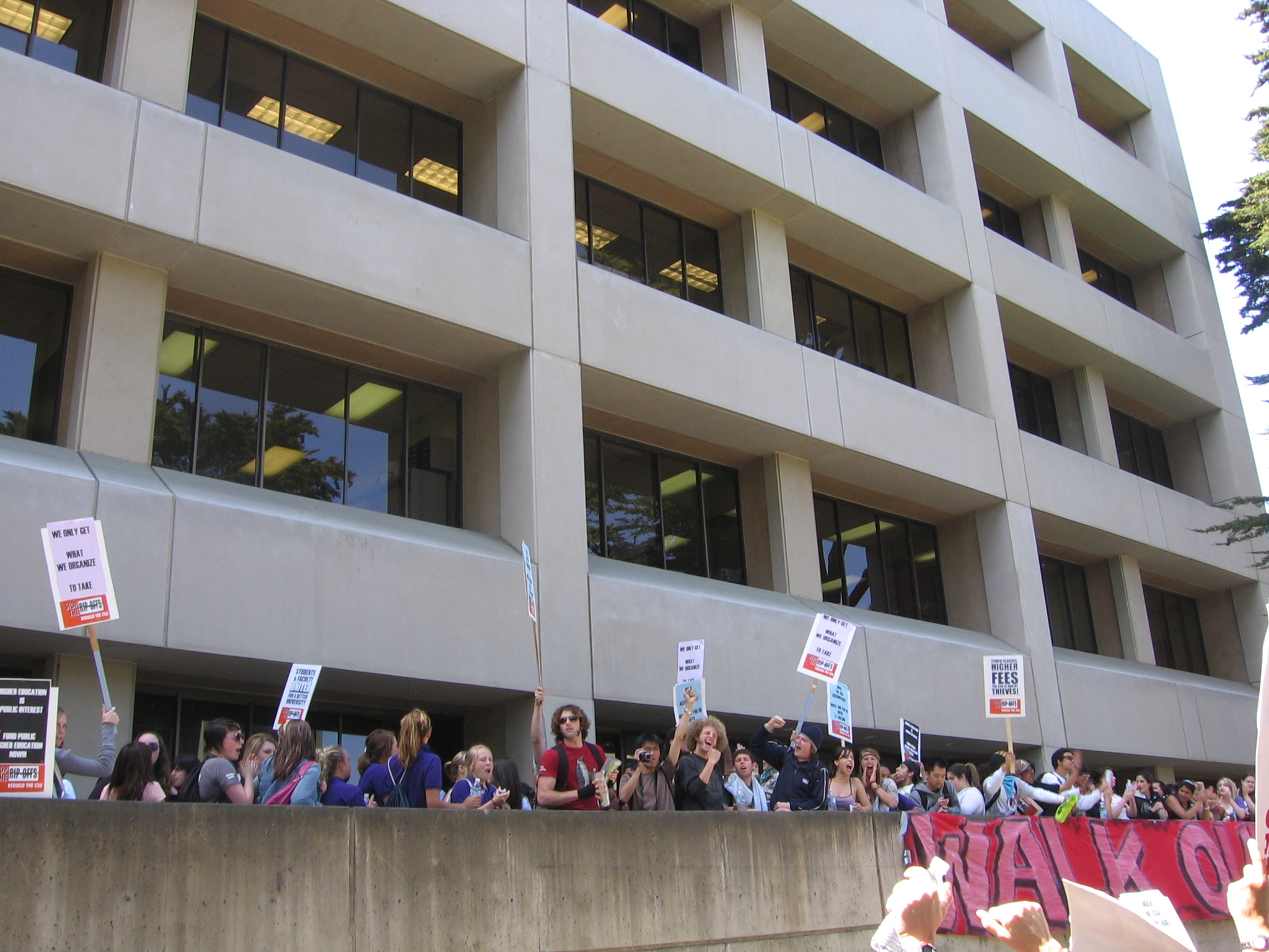 On Thursday, April 26th, Students at SFSU engaged in a five hour long march today to protest the impending fee hikes as well as class size and funding cuts to EOP programs. Students also protested the administration in general for its lack of support for students. Students gathered on Malcolm X plaza beginning at 10:00AM. After a large number of students gathered they set off in a march through campus buildings. They marched through the Humanities building, followed by Burk Hall and the HSS building. All the way students carried signs displaying messages such as "Hold the CSU Accountable" and "Stop Fee Hikes", Chanting slogans and cheers, and drumming as loud as possible. The March returned to Malcolm X Plaza briefly before continuing to the Administration building. Students stood outside the administration building for a short period of time before the chant of "Let's Go In" rose from the crowd. There was a moment of hesitation before the crowd plunged into the building. Police presence was light to non-existent so students filled the building. Unfortunately the Fifth floor which houses the President Corrigan's office was locked and Corrigan was not at school. After the building fire alarm went off twice students made their way outside and regrouped before heading into the lobby. Students used the central stairs as a stage and let multiple speakers from the campus community talk. Afterwards the floor was turned over to students. By about 4:00PM the protest had dispersed. The general attitude of people present believe that the protest was a great success.