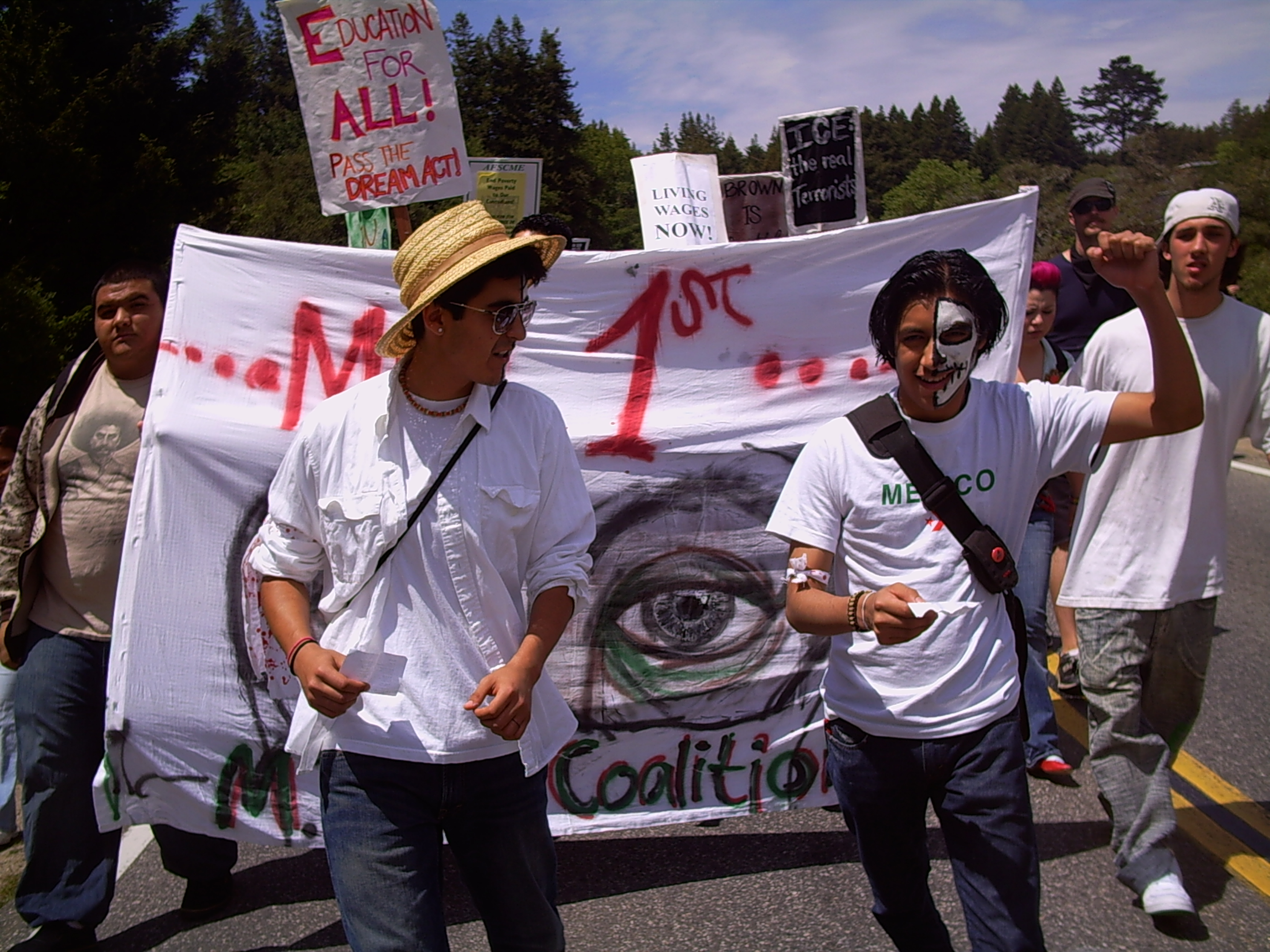Despite several racist raids that were conducted all over the country in the days leading up to May 1st, approximately over half a million immigrants and supporters marched together all over the U.S. In Santa Cruz, a march with 350 students went from the center of UCSC and converged with a hundred community members in the downtown area. Spirits were high and there was a lot of support from motorists, pedestrians, and school children (who started chanting at us on the way).
