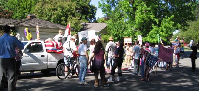 (Sacramento, CA) On Saturday, May 5th, Cindy Sheehan and members of Code Pink joined attorney activists Stephen and Virginia Pearcy and many other grassroots peace activists who marched to Congresswoman Doris Matsui's home to demand that she make no more concessions to the Iraq war spending bill.