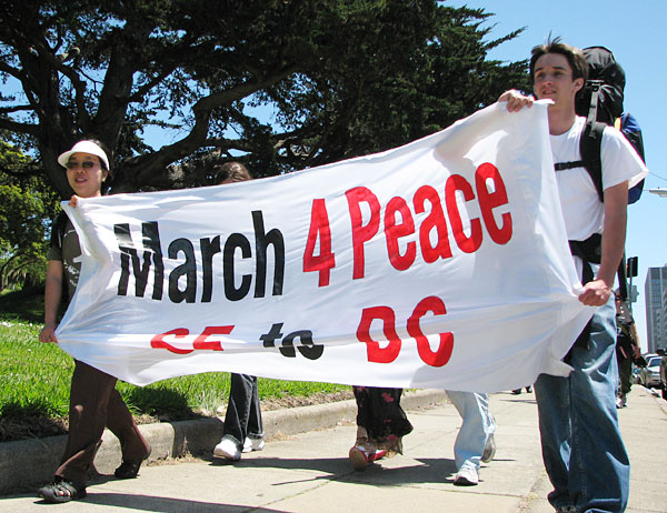 Supporters from various local anti-war organizations Not in Our Name, The World Can’t Wait – Drive Out The Bush Regime, Code Pink, and the International Socialist Organization helped kick off the journey with a small rally and accompanied the marchers to the Golden Gate Bridge.