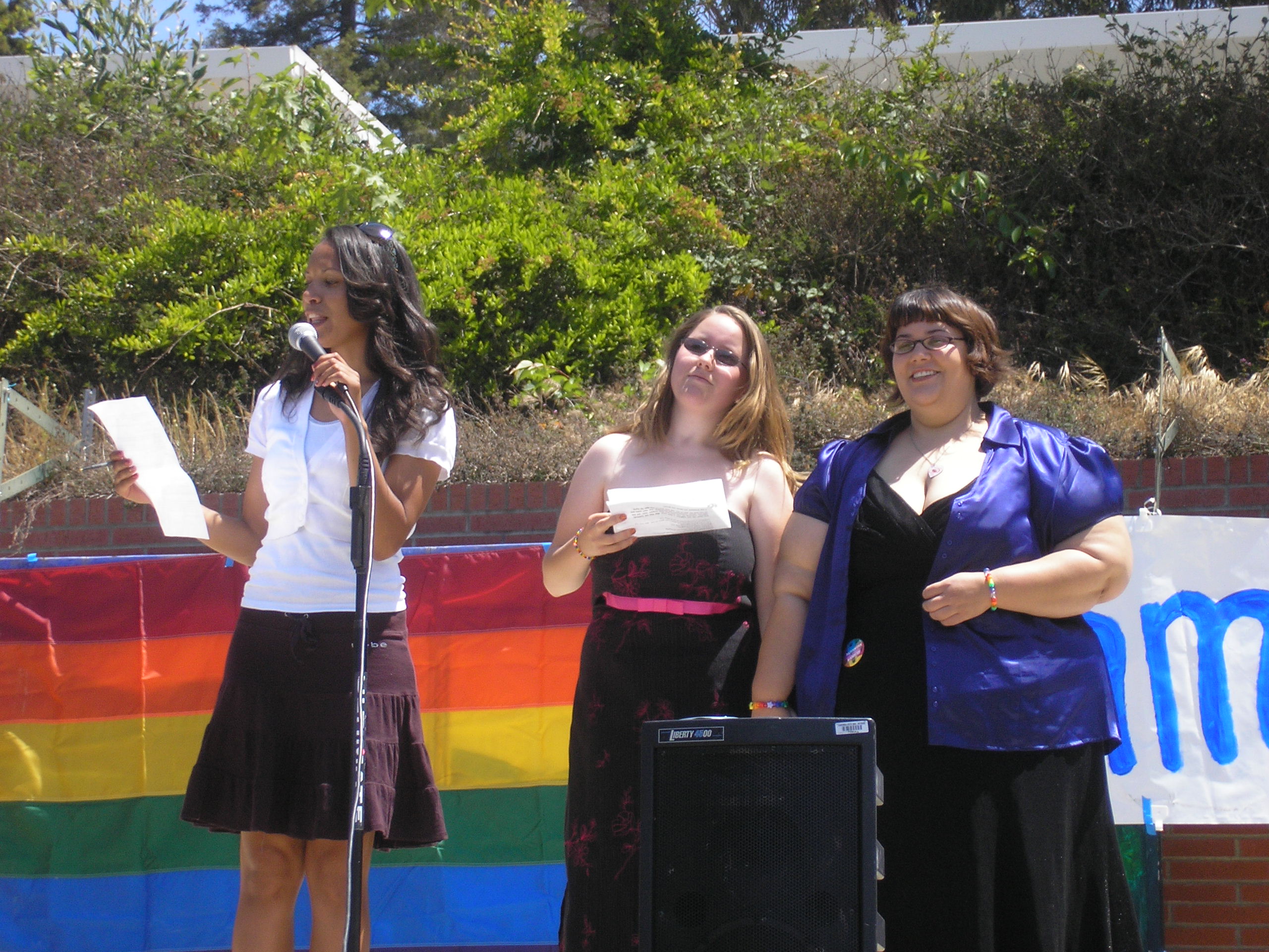 The mock wedding began at twelve noon on Agora Stage, which is the free speech area of campus. Four couples got “married” including three female/female couples and one male/male. Of the couples who “married” were Tina Phillips, member of QSA and Heather Thompson, the president. All of these couples were not “real” couples but just volunteers who wanted to lend their support in a symbolic action. All participants were students at Cal State East Bay. At the end students were invited to come up and get married, and there was a bouquet toss, and first dance.