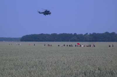 The activists scattered across the fields, covering a wide area. As some attempted to cross a country road, police unleashed water cannons and a cloud of tear gas; medics were on hand to treat the injured. One group of a couple hundred people was surrounded by police for nearly half an hour, before seven helicopters descended into the field and the cops loaded up and departed.