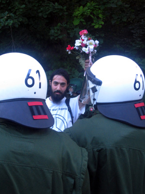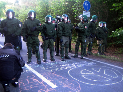Meanwhile, another group also numbering in the thousands reached Gate II of the fence to the east of Heiligendamm. A sit-down blockade was established on Lindenallee, bordering the by railroad track, leading to Gate II out of Bad Doberan. Here, too, protester held their ground overnight, and their numbers increased again on Thursday.
