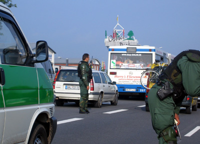 After undergoing pass controls on the roadways and bag searches at train stations and on the streets, protesters gathered at a large park in Admannshagan starting about 9 am on Wednesday. The early arrivals were later joined by marches coming from elsewhere, making up a diverse demonstration of about 2000 people, ranging from clowns to black blockers to organized Socialist and Communist groups.