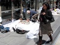 On June 7th, dozens of people gathered at the San Francisco Federal Building to vigil and conduct civil disobedience to oppose the ongoing occupation war in Iraq. Organized by Declaration of Peace Bay Area, this event takes place every first Thursday of each month. While activists tried to block the entrance to the building, the names of Iraqi war dead were read. Jeff Paterson writes: "There were nine people arrested — out of approx. two dozen who were risking arrest. Most of the arrests took place when a group of protesters entered the Federal Building lobby and staged a die in at the security metal detectors. All arrested were released after a couple of hours."