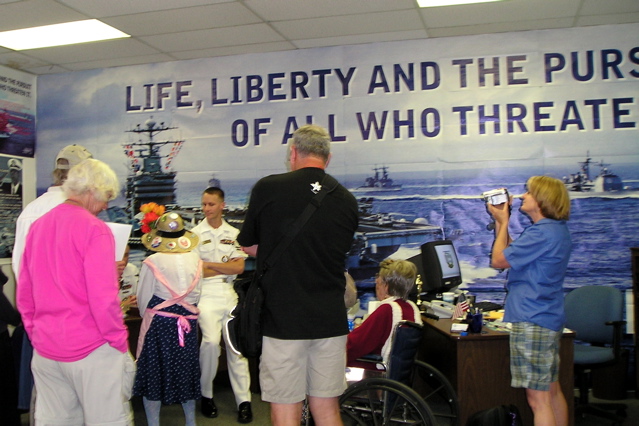 The protesters, including members of the Raging Grannies of the Women’s International League for Peace and Freedom (WILPF), called on the recruiters to end their efforts to enlist young people. They stated that the recruiters have a legal obligation to cease recruiting for an illegal war. The Grannies, clad in aprons and flowered hats, sang several songs at the recruiting office, including “When The Grannies Rule The World,” to the tune of “When Johnny Comes Marching Home.” The refrain ends with the line, “We’ll all be safe when the Grannies rule the world!” They spent more than an hour talking with recruiters.