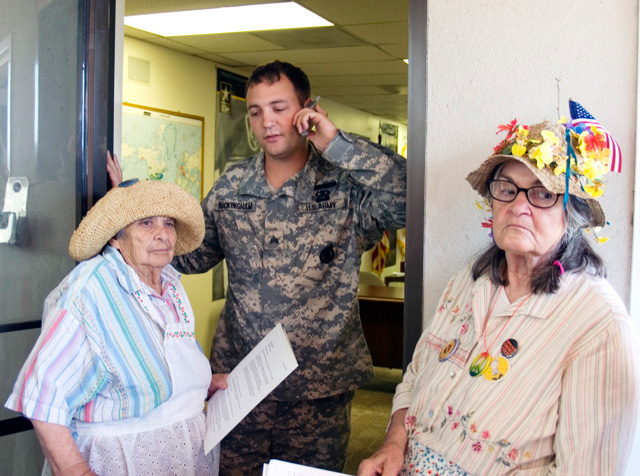 Protesters lined 41st Avenue with signs and banners calling for an end to the occupation of Iraq and supporting military resisters. The Raging Grannies of the Santa Cruz Chapter of the Womens International League for Peace and Freedom led people upstairs to the Army recruiters. The Grannies had planned to speak with the recruiters, but they were denied entry into recruitment office. The recruiters informed the Grannies that they "do not qualify to join the Army, but are welcome to send care packages to the soldiers." Ruth Hunter of the Raging Grannies quipped back that she did not like the sexist nature his statement.