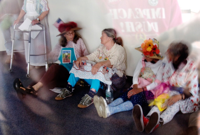 At least two Capitola police officers monitored the demonstration. Army recruiters called the police to clear the door to the recruitment office which was being blocked by Ellie Foster and Jan Harwood of the Raging Grannies. A commanding police officer was called to the scene before any arrests were made. The property manager was also called so that he could officially and politely request that the Grannies clear the door. This request was witnessed and video recorded by officers from the Capitola Police Department. Officer Andrew Dally then read a short statement, three times over a period of about five minutes, on behalf of the people of California and declaring an unlawful assembly. The demonstration ended with ten people arrested for nonviolent civil disobedience, including David Hofvendahl and his sixteen year-old son, Trevor, as well as eight members of the Raging Grannies.