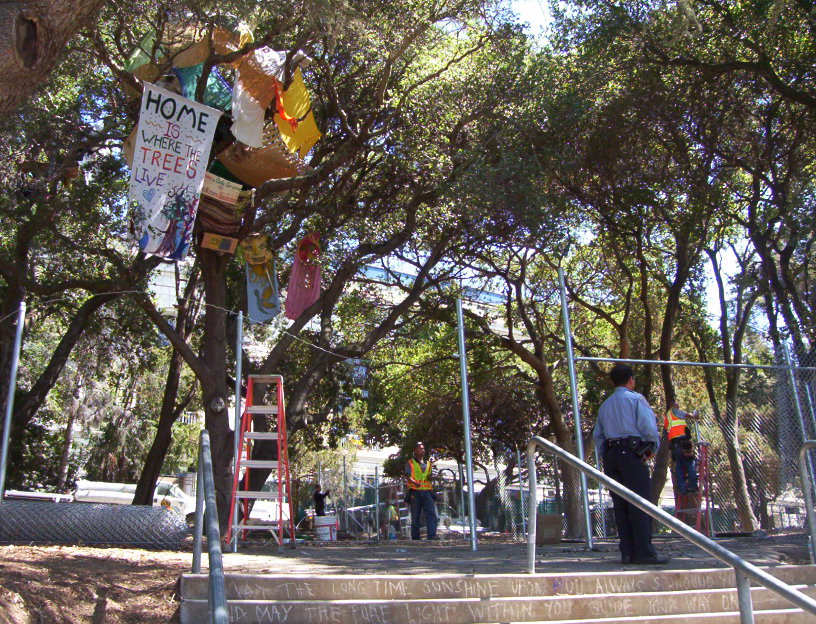 The tree-sits in the Oak Grove were rudly awakened at 6:00 am by twenty police who surrounded the area and put up police tape around the grove. Those in the trees were safely out of reach and they called for support. Soon dozens of supporters arrived but so did a group of workers who bean to build an eight foot chain link fence around the central part of the grove.