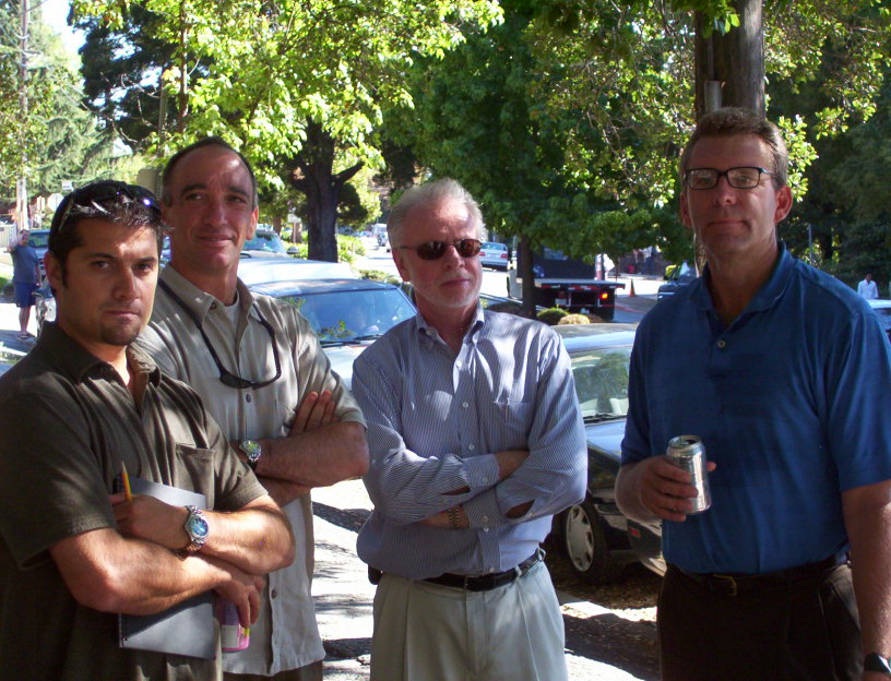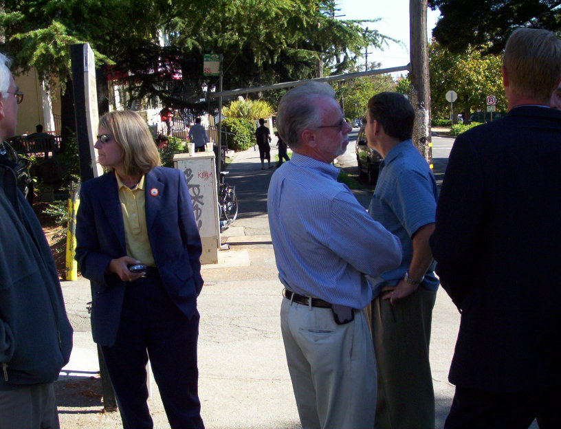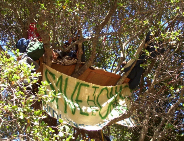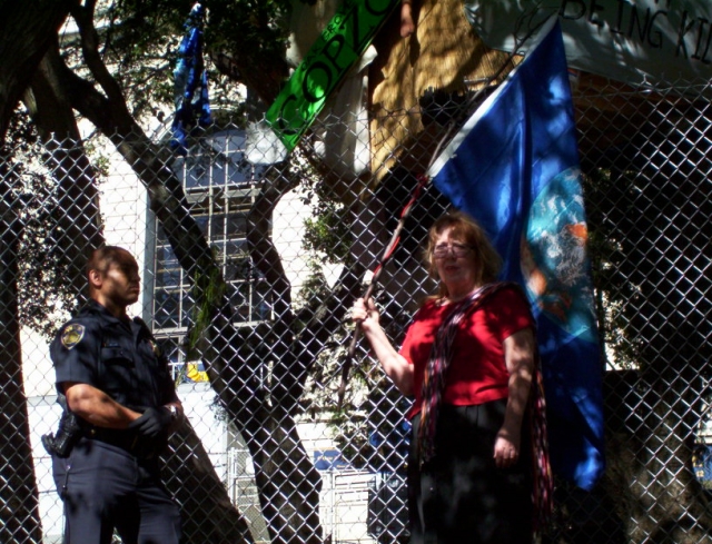 At the grove the tree sitters were putting up more lines between trees and getting suplied with food and water. Soon the Vice Chanceller and Chief or high up UC police woman and others had a little meeting on the corner. Starting at 5:00 was a planned Tree De-Fence party and ten cops came out of their fence and forced us away from the fence and onto the sidewalk. More people should and will be coming in the next few hours.