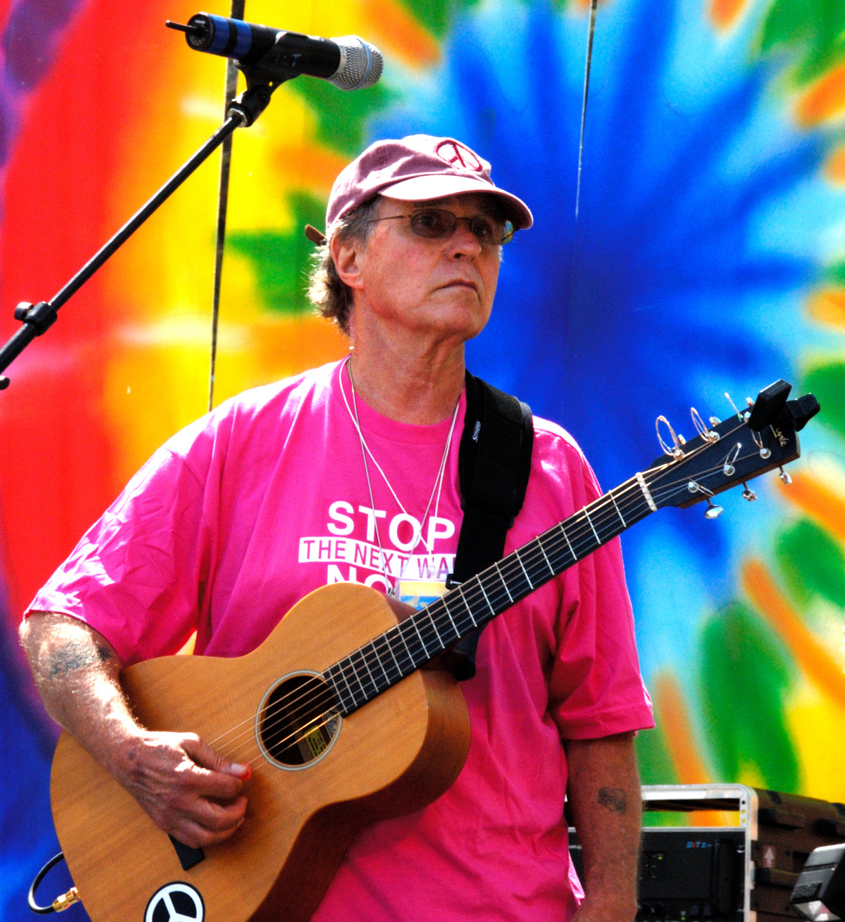 Country Joe McDonald wore a Code Pink t-shirt to protest the war in Iraq.