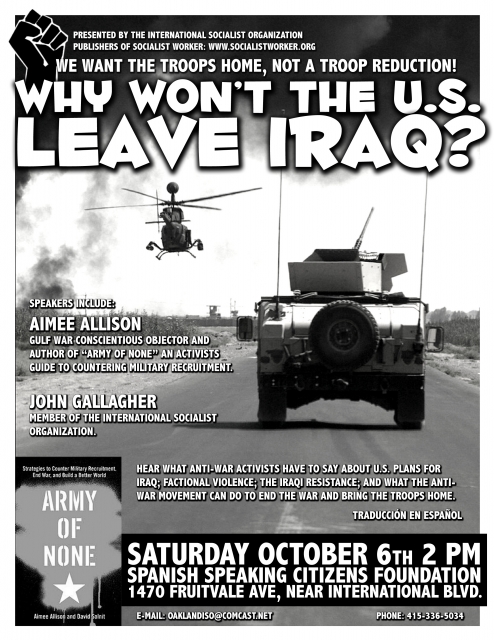 Speakers include Aimee Allison, co-author of the recently released "Army of None," Gulf War Conscientious Objector, and counter-recruitment activist; and John Gallagher, teacher and member of the International Socialist Organization.