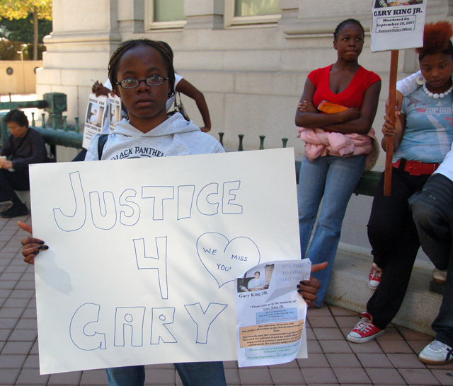 On Monday, September 24, over 100 family, friends, neighbors and other concerned people protested at Oakland City Hall against the murder of 20-year old Gary King, Jr.