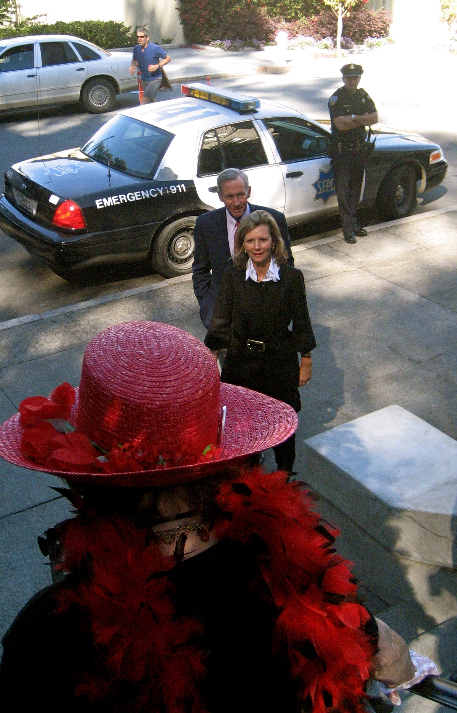 In speeches, chants and songs activists made the case that the $2300-4600 (per guest!) fundraising ticket monies should go directly to funding programs in the San Francisco Bay Area. The Raging Grannies sang about the need for public funding for elections in a song called *How Much for that Clinton in the Senate* to the tune of *How Much is that Doggie in the Window*. Much of this song aired in a lengthy story on Bay Area Channel 2 evening news addressing the issue of high roller campaigns. CodePink's Nancy Mancias and Raging Grannies Action League's Gail Sredanovic, when interviewed by KTVU's reporter, pointed out that large donor funding does not serve the public interest and that it amounts to a system where favors are bought by the wealthy.