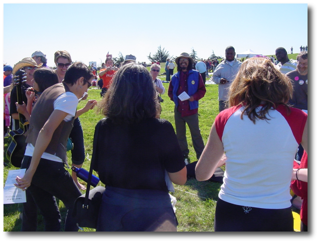 Close to noon, the field near the Berkeley marina which Brad Newsham had chosen for his 4th Beach Impeach began to fill with people. The excitement was palpable and contagious-- especially when Cindy Sheehan and Cynthia McKinney arrived.