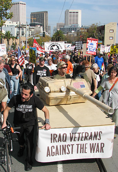 Tens of thousands march against endless U.S. war and occupation of Iraq. Veterans and supporters of GI resisters help lead march from SF City Hall to Dolores Park.