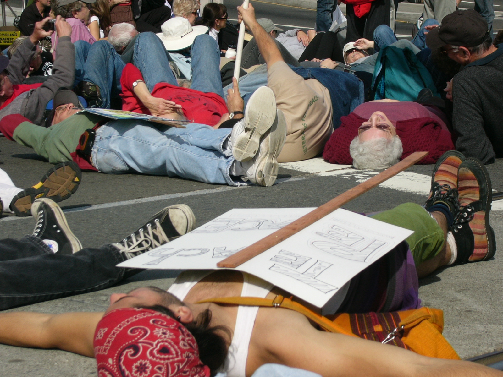 One of the ANSWER-led moments was a staged die-in of most marchers along Market street from Octavia to the civic center. There were a variety of veteran associated groups, as well as unions, churches, ethnic, and candidate contingents. There were also some creative music groups, a large team performing Thriller by Michael Jackson, and bullhorns.