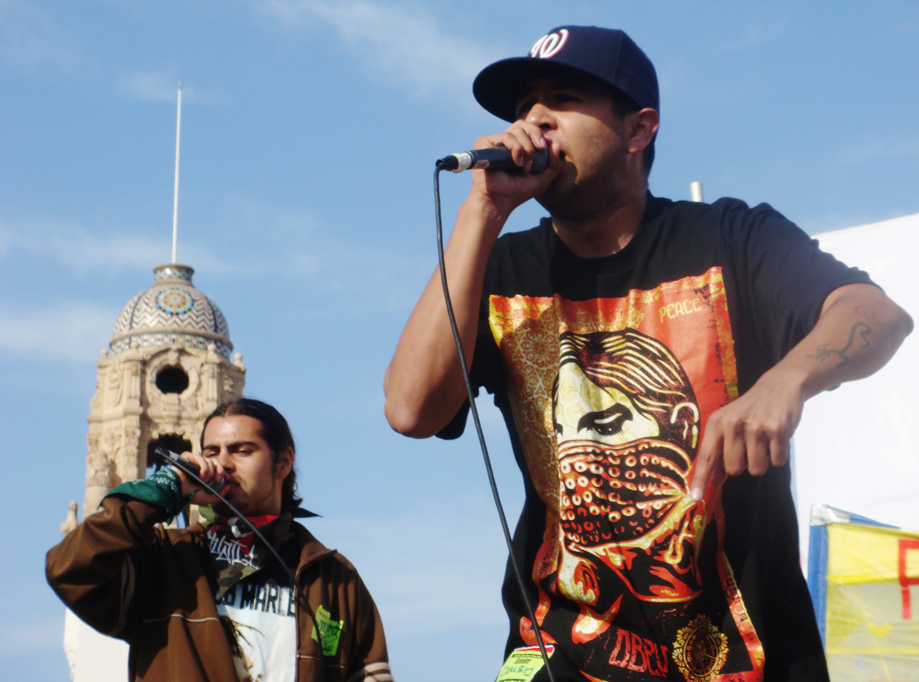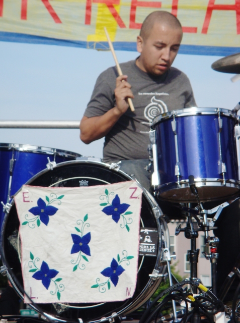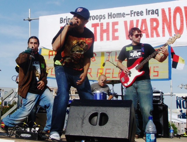 Two local music groups performed onstage, Doba Doza, backed up by members of the Watsonville Brown Berets and Para la Gente. Both groups perform music with revolutionary political messages. Doba Doza is an all female group with members from Watsonville, Salinas and Monterey. They performed as the last act before the march began and did two songs, one about stopping the war and another about the oppression faced by people of color in our society. Para la Gente is based in Watsonville and Salinas and composed of teachers and activists. They performed after the march and cries of "¡Otra!" after the last Para la Gente song raised from the crowd.