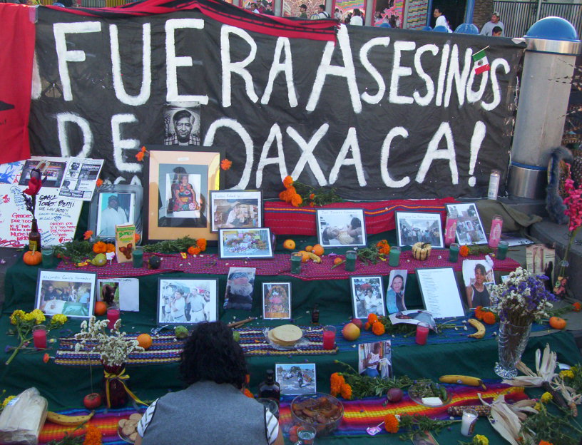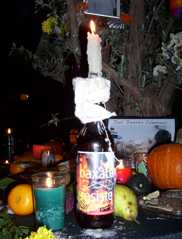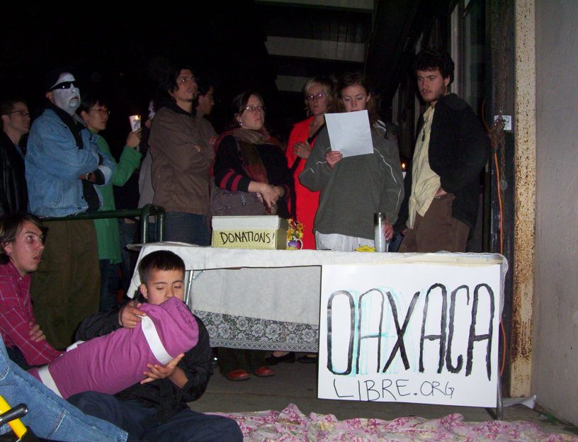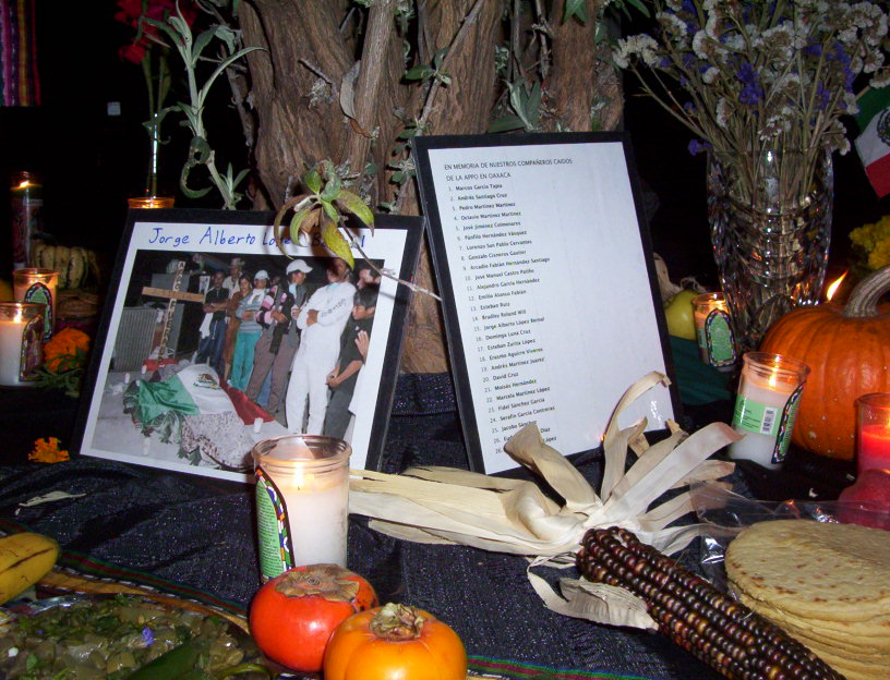 November 2nd is Day of the Dead in Mexican traditional culture. Altars are built to remember, sustain and communicate with dead friends and family members. Last year there was a huge popular uprising in Oaxaca to protest the government and fight for a better world. People formed the (Popular Assembly of the People of Oaxaca (APPO) and the Commune of Oaxaca (after they drove out the police) and held it for four months. It was beaten down with around 30 protesters killed and many wounded and jailed. One year later the struggle goes on but in a less dramatic form. We wanted to do what we could to support it.