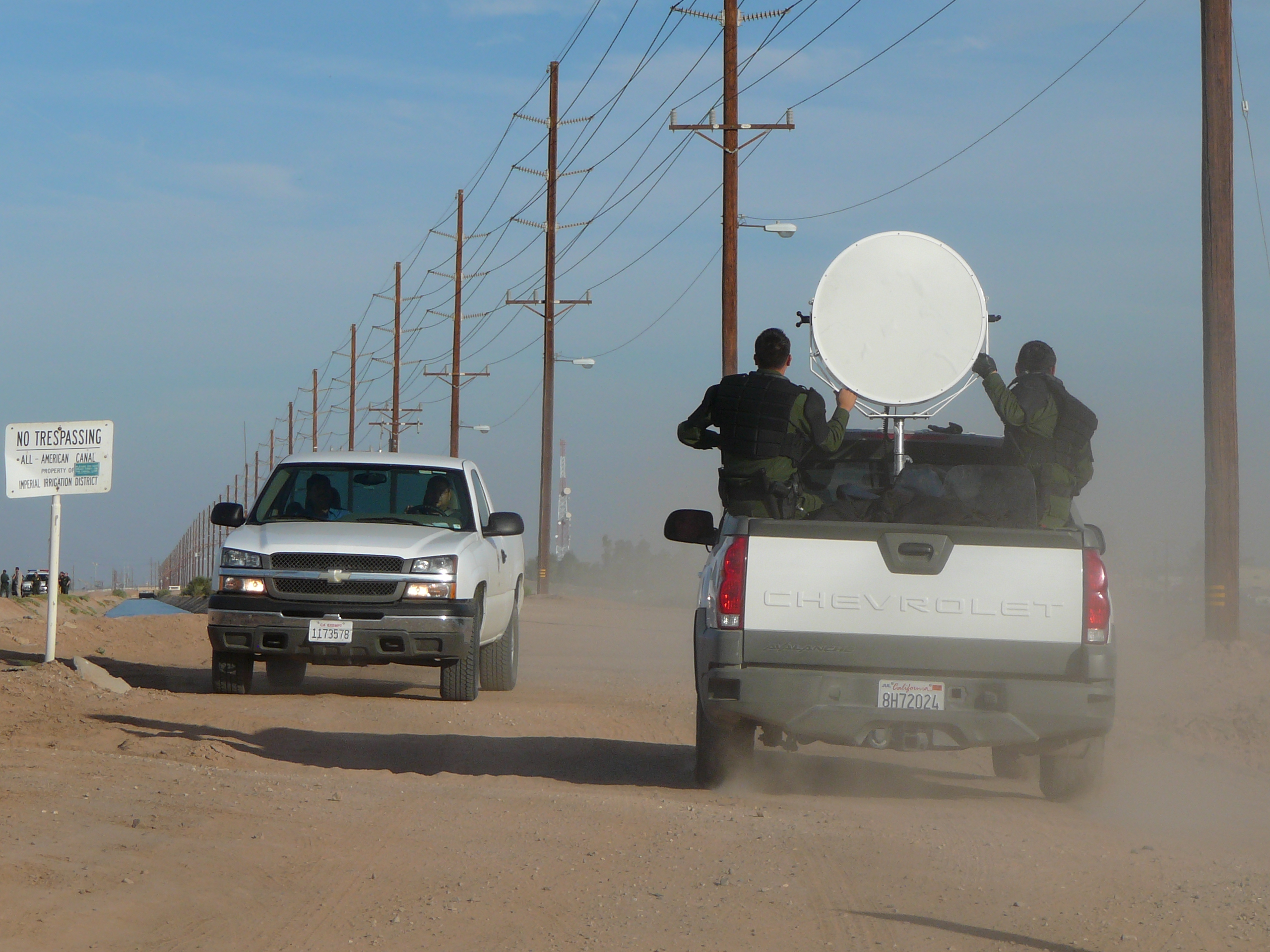 I saw a truck-mounted dish of that size at the RNC protests. It was a "sound cannon"--meant to disperse crowds through the use of low-frequency amplified sound. Apparently it makes you lose your bowel functions. Anyway, the sound cannon had more buttons and things on it. Could be for la migra's DirectTV.