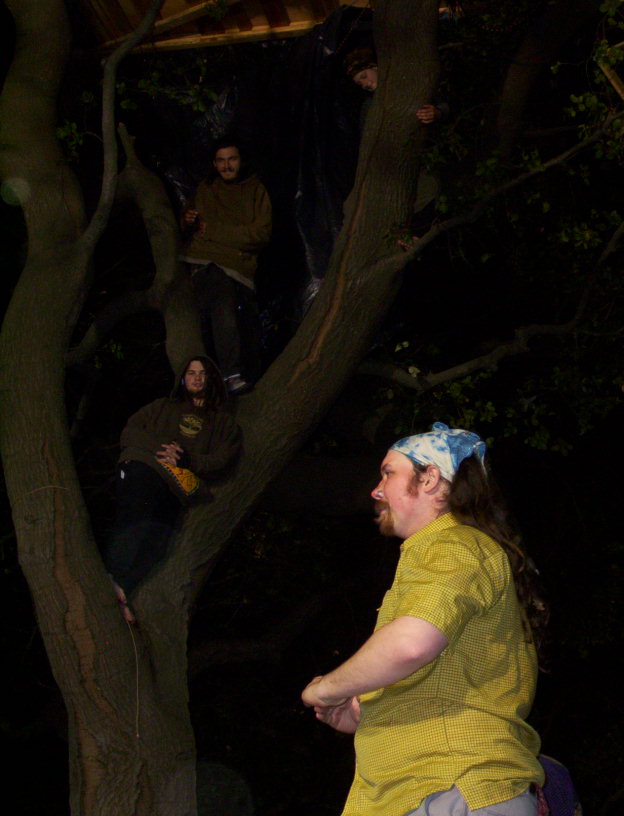 Later Circus Pandemonium had a performance in the grove. The whole grove is lit up by bright new lights and this was perfect for the performance. They juggled and did skits about the tree sit and other performances. The best was wen one woman lowered long cloth from a tree sit and did airial dancing.