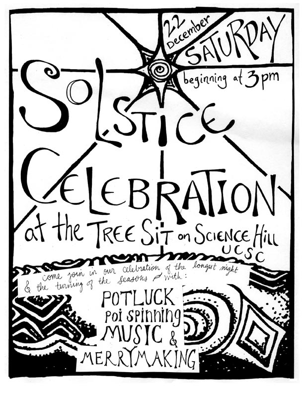 The gathering planned on Science Hill in observation of the Winter Solstice will be taking place from three o clock today, on until dark. We plan to observe this change of the seasons with music, a potluck, poi spinning (instruction & practice) and other festivities near the trees occupied by individuals dedicated to protecting the forest of upper campus.