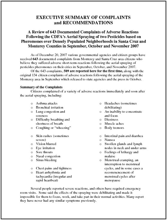These reports are 2 200 pg. documents: one documents over 600 adverse reactions to the spray in Santa Cruz and Monterey counties, and the other contains research on the chemicals we are being sprayed with and the bogus info the gov. is telling the public. The legislature will meet with the CDFA on Thurs. to review the spraying plans. The inside word is (this has not been publicly announced, but was told to a city council member) is that the CDFA is now planning to spray starting in March-April, and will spray Monterey, Santa Cruz, Santa Clara county, San Francisco county, Marin county, and Alameda county. (perhaps more). This is a major assault on the people's right to life and safety, and our environment.