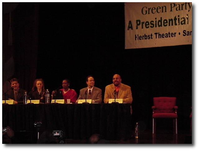 Of note: To my knowledge, Matt Gonzalez did not appear as a moderator as advertised. Elaine Brown did not appear because she left the Green Party.