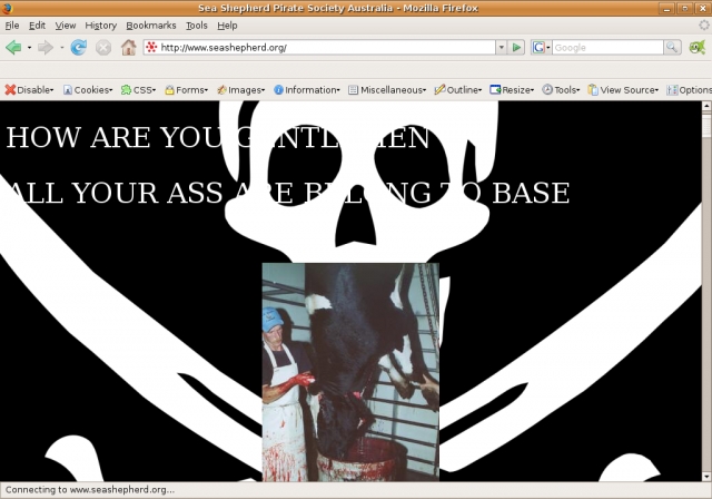 The normal Sea Shepherd index page and related content was replaced by a page titled 'Sea Shepherd Pirate Society Australia'. It featured pictures of a cow and pig being slaughtered and butchered from http://www.slaughterhousecam.com on a jollyroger background. The only writing on the site is "HOW ARE YOU GENTLEMEN ALL YOUR ASS ARE BELONG TO BASE" and "Copyright © 2008 Sea Shepherd Pirate Society Australia. All rights reserved."