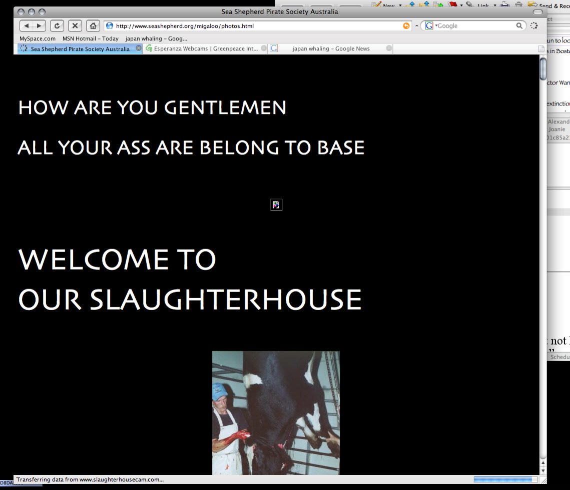The normal Sea Shepherd index page and related content was replaced by a page titled 'Sea Shepherd Pirate Society Australia'. It featured pictures of a cow and pig being slaughtered and butchered from http://www.slaughterhousecam.com on a jollyroger background. The only writing on the site is "HOW ARE YOU GENTLEMEN ALL YOUR ASS ARE BELONG TO BASE" and "Copyright © 2008 Sea Shepherd Pirate Society Australia. All rights reserved."