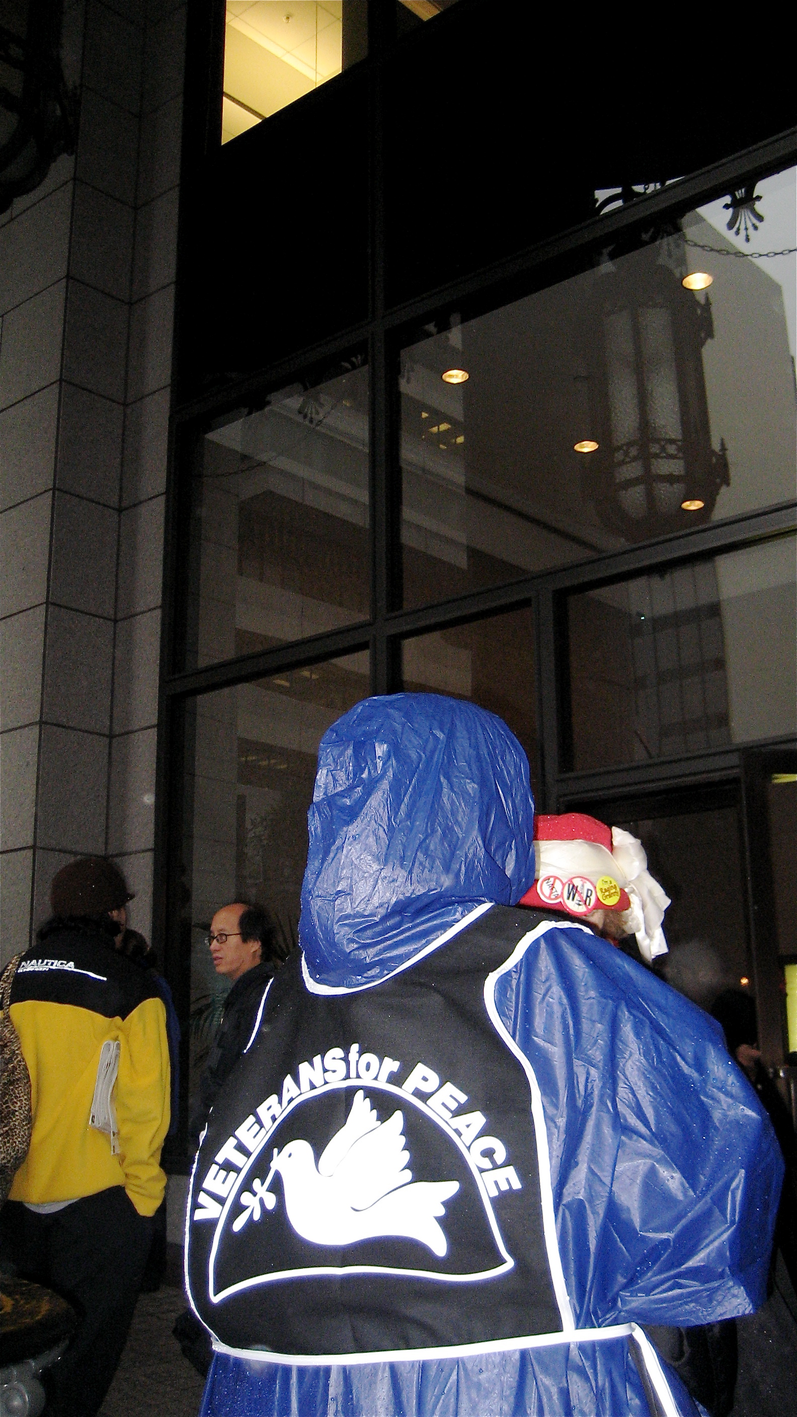 Members of the Raging Grannies Action League stood in the rain in front of the Canadian Consulate with COURAGE TO RESIST in San Francisco.
