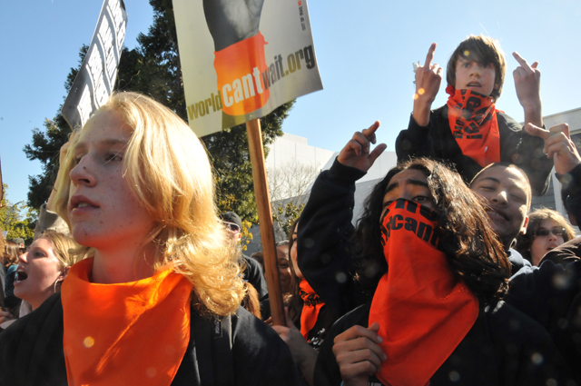On Feb 12, 2 sides faced off in Berkeley. On the one side were anti-war and progressive people supporting the city council's resolution last week saying that marine recruiters are unwelcome in Berkeley. On the other side were pro-Iraq war, pro-marine reactionaries mobilized by talk radio etc. Despite all the media reports that hordes od pro-war people would be decending on Berkeley the anti-marine recruiter protesters outnumbered the reactionaries most of the day. Hundreds of Berkeley High students Berkeley High students joined the protest.