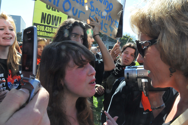 The police were extremely brutal, especially to the protesters from Berkeley high School. There were a number of assalts on High School students by the pro-Marine demonstrators, usually in full view of the police. None of these reactionaries were arrested. (According to the SF Chronicle one pro-Marine demonstrator was arrested when he went into the Code Pink Encampment and threatened them with a knife). The police arrested a 13 and 15 year old students after they were assaulted by the pro-Marine bullies. Both youth and other demonstrators went to the police station to demand that they be realed where they were attacked again by the police (and another young woman was arrested).