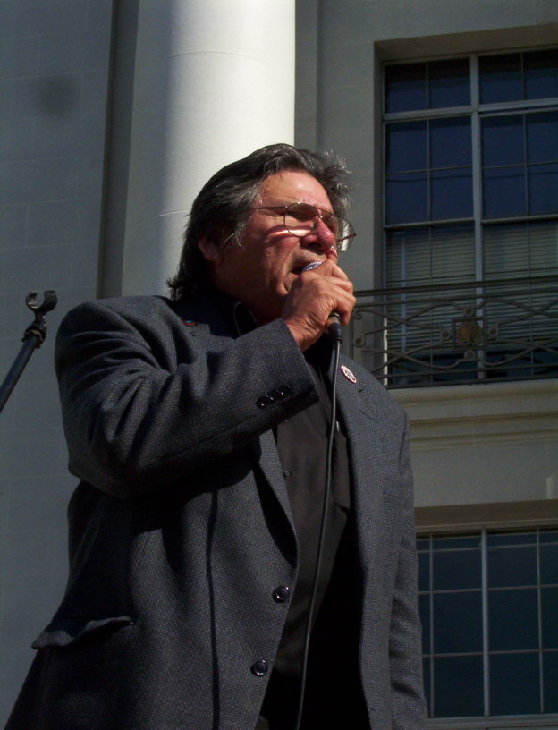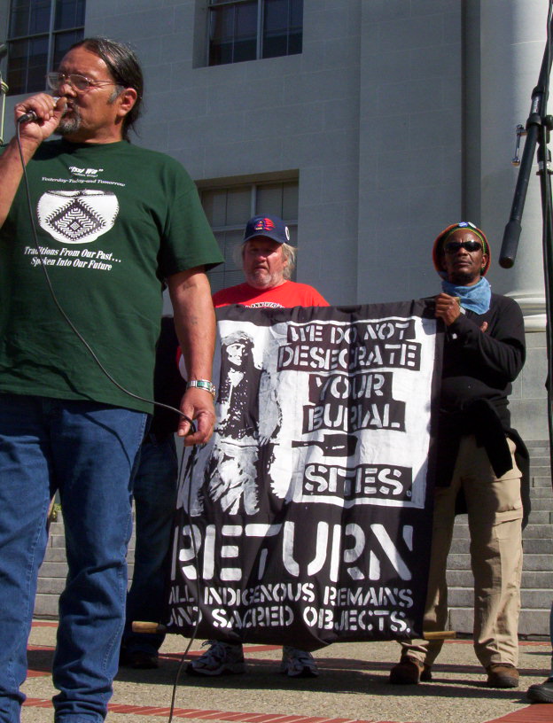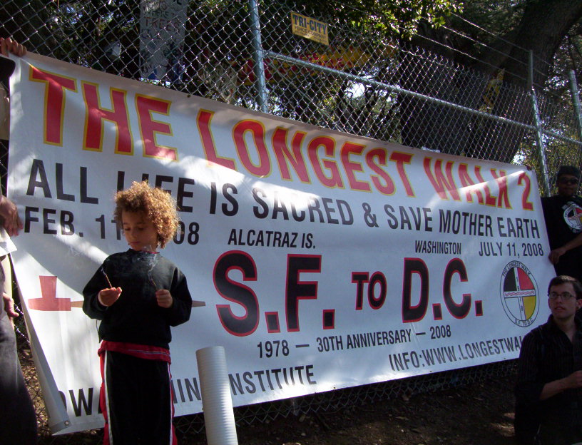 The Longest Walk 2 has begun. before the official beginning many participants rallied at the Oak Grove. They asked that all sacred sites and burial grounds of Native-Americans be preserved. They also asked for the bones of tens of thousands of native people be returned and no longer held in basements at UC Berkeley. The walkers and Oak Grove supporters gathered for speakers, prayers and mutual support. Then the police allowed the crowd into a part of the Oak grove for a few minutes to lay sacred herbs at the foot of a 200-year-old oak tree. The events at the grove ended and a rally at Sproul plaza began; to publicize the walk and to demand the return of Native-American bones and artifacts.