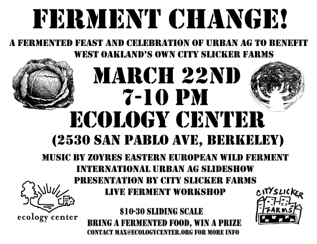 A FERMENTED FOOD FEAST to benefit for Urban Ag Heroes CITY SLICKER FARMS FARMS @the Ecology Center in Berkeley. There will be a large selection of locally made sauerkraut, tempeh, kambucha, sourdoughs, and more.