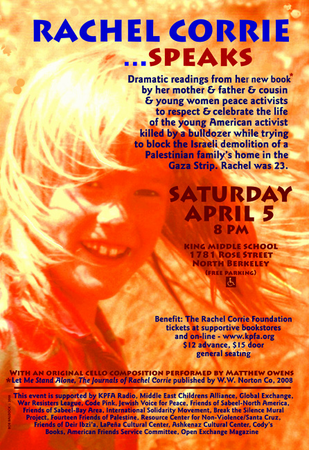Benefit: The Rachel Corrie Foundation. Supported by KPFA Radio, Middle East Children's Alliance, Global Exchange, War Resisters League, American Friends Service Committee, Code Pink, Jewish Voice for Peace, Friends of Sabeel-North America (FOSNA), Friends of Sabeel-Bay Area, International Solidarity Movement, Fourteen Friends of Palestine, Break the Silence Mural Project, Friends of Deir Ibzi'a, Resource Center for Non-Violence/Santa Cruz, Ashkenaz Cultural Center, LaPena Cultural Center, Cody's Books, Open Exchange, Bay Area independent bookstores.