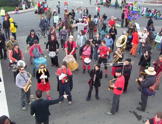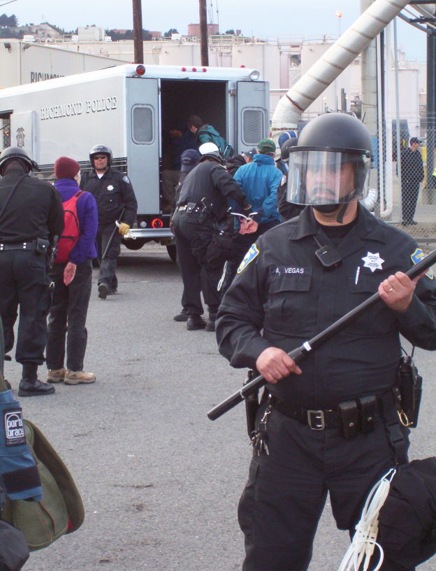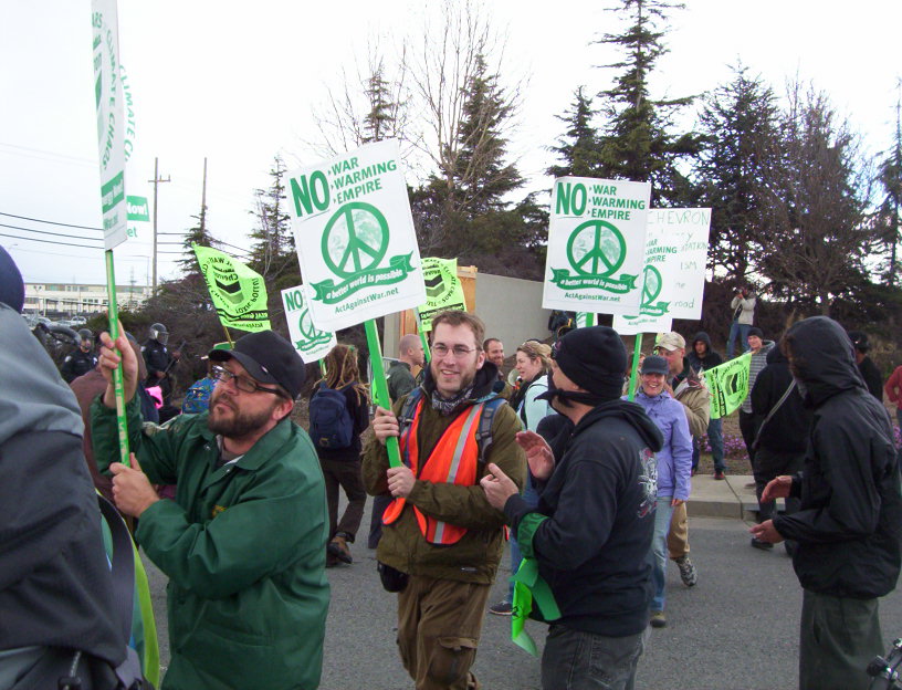 In Richmond, CA we protested the war in Iraq (etc.), Environmental Racism and Global Warming by blockading the Chevron oil refinery. We gathered at noon for speakers then marched to the refinery. Chevron had been shut down all day in anticipation of our protest. We marched to one of the main gates and people laid out lock down tubes and barrels and up to 50 people locked themselves down. Bands played, there was street theater and food. people danced and denounced the war and Chevron. The police had the entrance blocked with barricades and many police but said that they would not arrest people. After many hours the lockdown was ended. people held a circle gathering then quickly moved the barricades and went toward Chevron. Police were startled but formed a line and people sat down. Other people took down the rest of the barricade and put it out in the intersection to keep the street closed. People sat in front of the police for several more hours. Eventually the police arrested 25 people. We were then forced onto the sidewalk with quite reduced numbers. We held a quick rally and headed home.