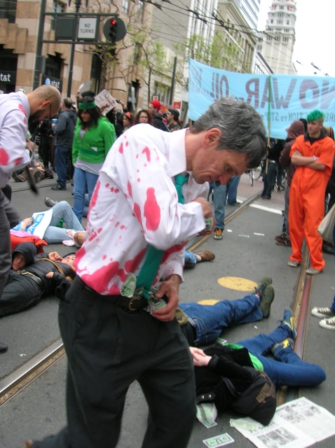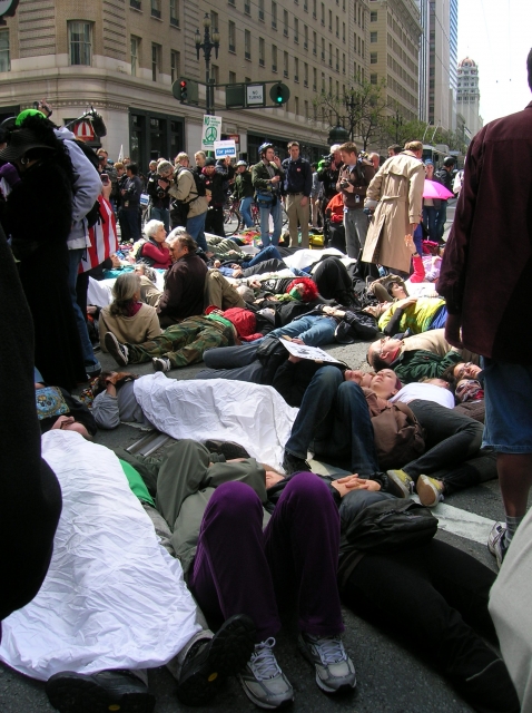 this was the beginning of the noon die in. a procession went to all corners on the intersection and then went to the into the middle where people laid down.