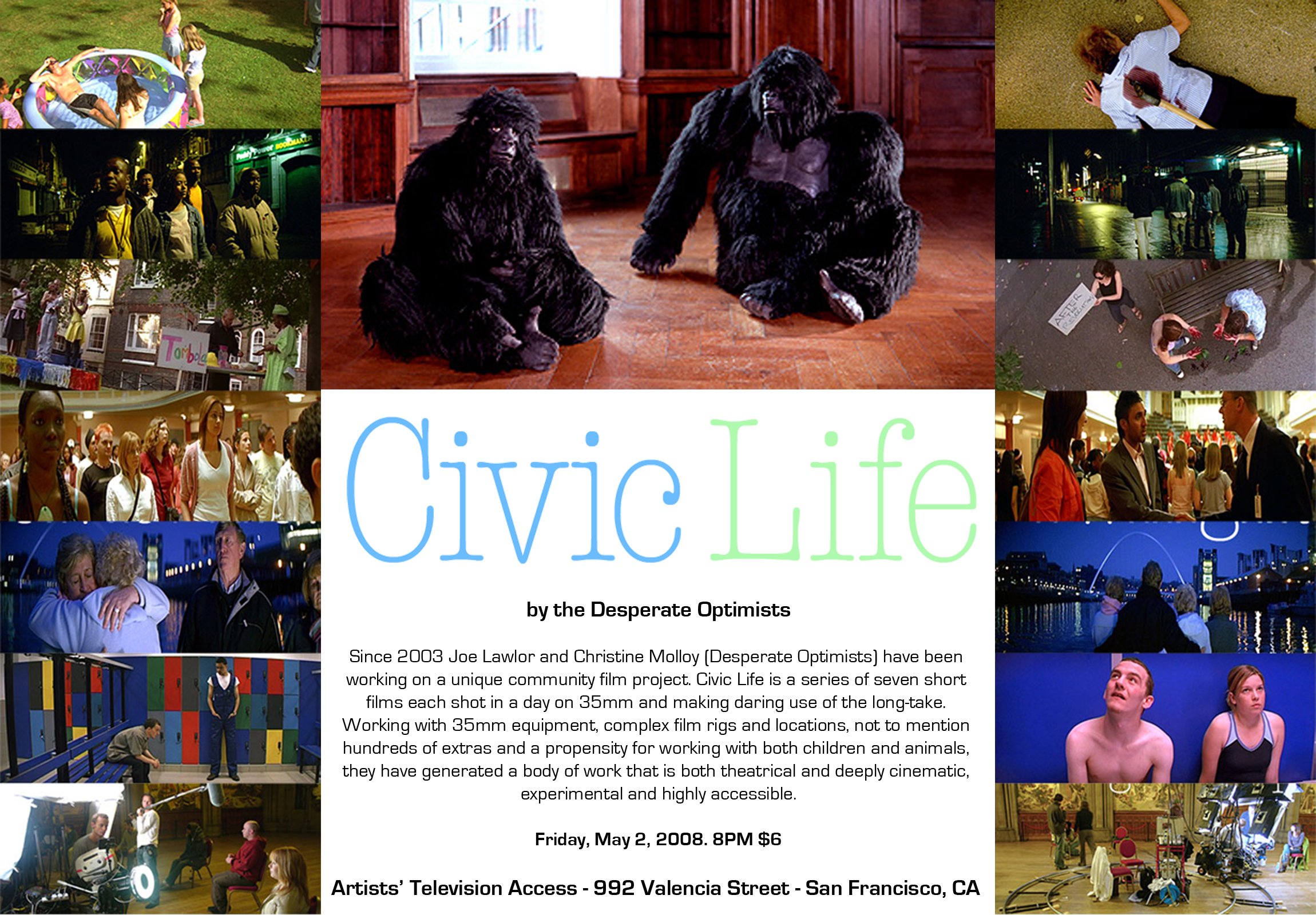 Since 2003 Joe Lawlor and Christine Molloy (desperate optimists) have been working on a unique community film project. Civic Life is a series of seven short films each shot in a day on 35mm and making daring use of the long-take. Working with 35mm equipment, complex film rigs and locations, not to mention hundreds of extras and a propensity for working with both children and animals, they have generated a body of work that is both theatrical and deeply cinematic, experimental and highly accessible.