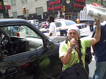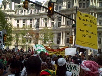 After confronting the racist counter-protest, the march then proceeded to Philadelphia City Hall. After circling City Hall several times and occupying the street in front of the building at 15th and Market, protesters gathered at City Hall's Northwest corner and heard many speakers including Cynthia McKinney, Julia Wright, Herman Ferguson, Harold Wilson, and Mumia's daughter, Goldi.