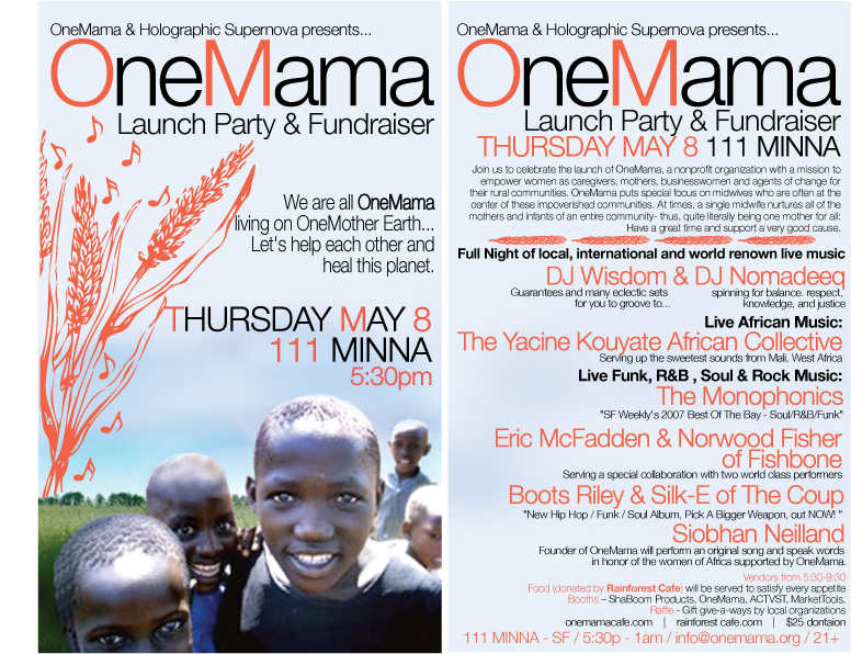 Live performances by The Yacine Kouyate African Collective, The Monophonics, Eric McFadden & Norwood Fisher of Fishbone, Boots Riley & Silk-E of The Coup, DJ Wisdom, DJ Nomadeeq, and Siobhan Neilland. Attendees will also enjoy food donated by Rainforest Café, drinks, a raffle with local give-a-ways, and an auction. Tickets to the event are $25.00, available at the door or at http://www.onemama.org.