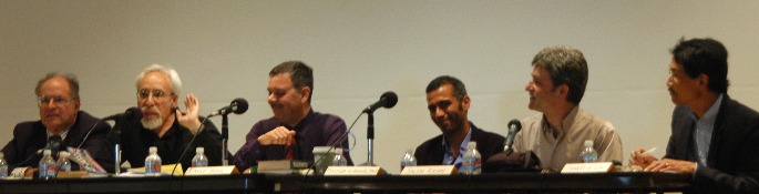 Second, Gil Villagrán was not "forced to bow out" of the panel. David Meir-Levi was added to the panel the day before the teach-in. The photo shows the entire panel with (from left to right) David Meir-Levi, Gil Villagrán, Emad Yahya, Hossam el-Hamalawy, Salem Ajluni, and Sharat G. Lin.