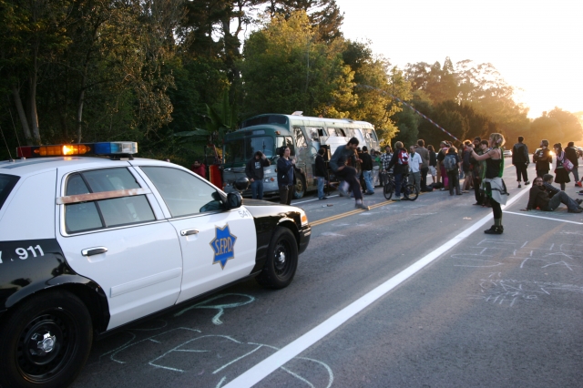 It left Civic Center around six PM. There was some confrontation early on while leaving Civic Center. The participants were pushed back onto the sidewalk for about five blocks and then claimed the streets once again. The police abandoned dealing with the party and soon left afterwards. At this point in time the party continued zig-zagging Haight street with some minor confrontations with motorists. Gaining more support along the way the part ended up at Golden Gate park in which a parked bus provided some tunes for a dance party and chalk/art session. Cops came later on and the people still danced. Eventually the action faded.